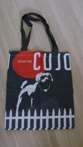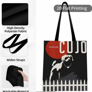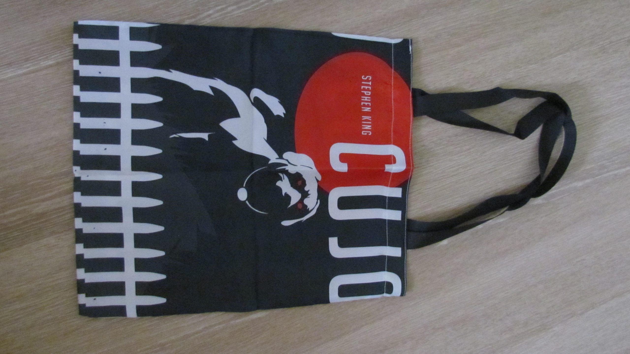 Geen sluiting, met lange hengsels en ruim vak. Voor en achterzijde zijn hetzelfde geprint.